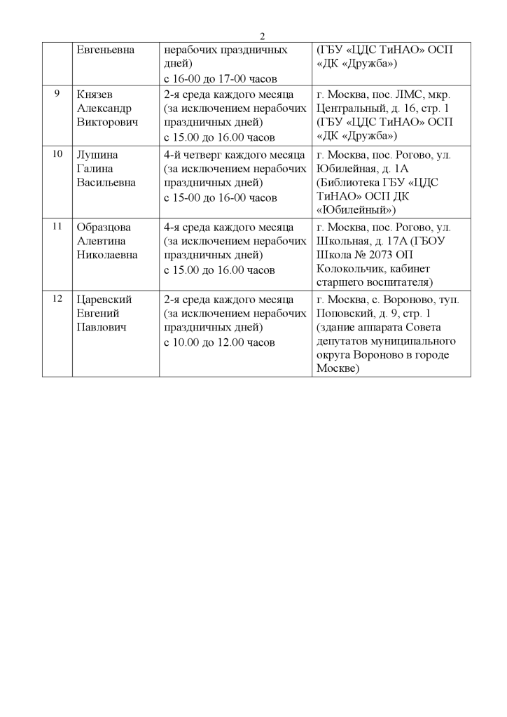 — Лично по адресу: г. Москва, муниципальный округ, с. Вороново, Поповский туп., д. 9, стр. 1 (в рабочие дни и часы работы аппарата Совета депутатов);